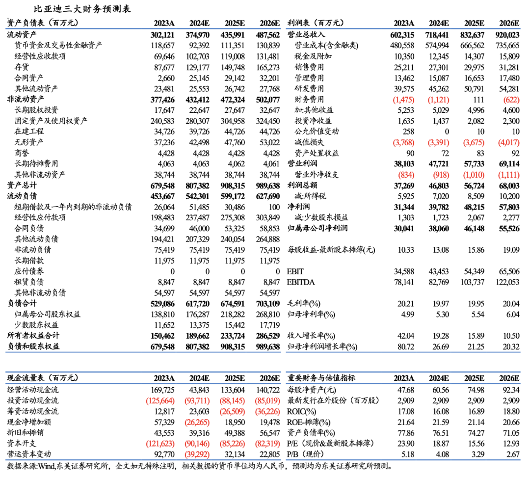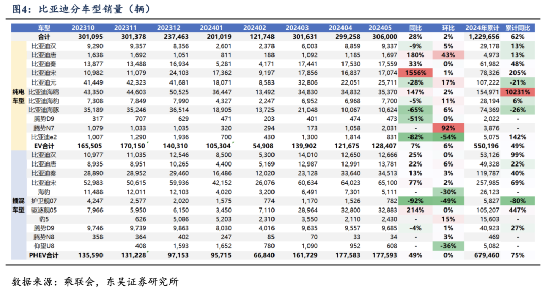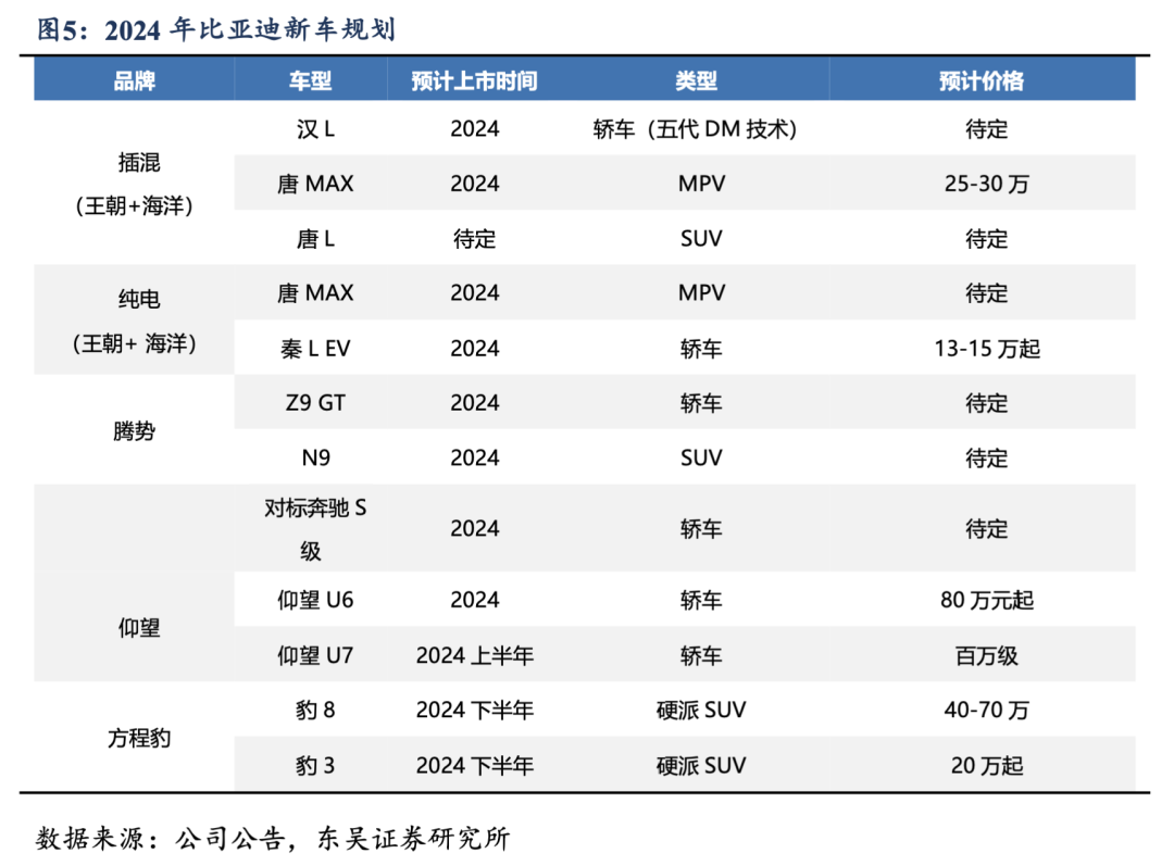 第五代DM技术持续强化车型竞争力,我们预计比亚迪24年销量380-400万辆。公司产品矩阵完备,仰望、方程豹补足高端车型。2024年至今已推出纯电性能超跑仰望U9、新车型元UP、方程豹系列3款车型。5月公司发布第五代DM技术平台,实现全球最高发动机热效率46.06%、全球最低百公里亏电油耗2.9L和全球最长综合续航2100公里,搭载于两款新车型-秦L-dmi、海豹06已上市。公司规划年内还将推出腾势3款、仰望U7。考虑到新车推出、高端车型逐步放量以及海外出口贡献增量,同时积极布局智能化,我们预计24年比亚迪电动车销量380-400万辆,同增30%左右。结构来看,高端车型迅速上量,预计24年腾势15万+、方程豹5万、仰望1.5-2万辆,上述三款车型占比6%,预计出口50万辆,占比12%。