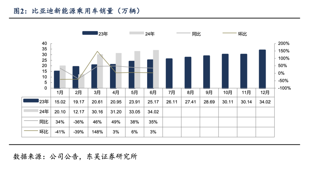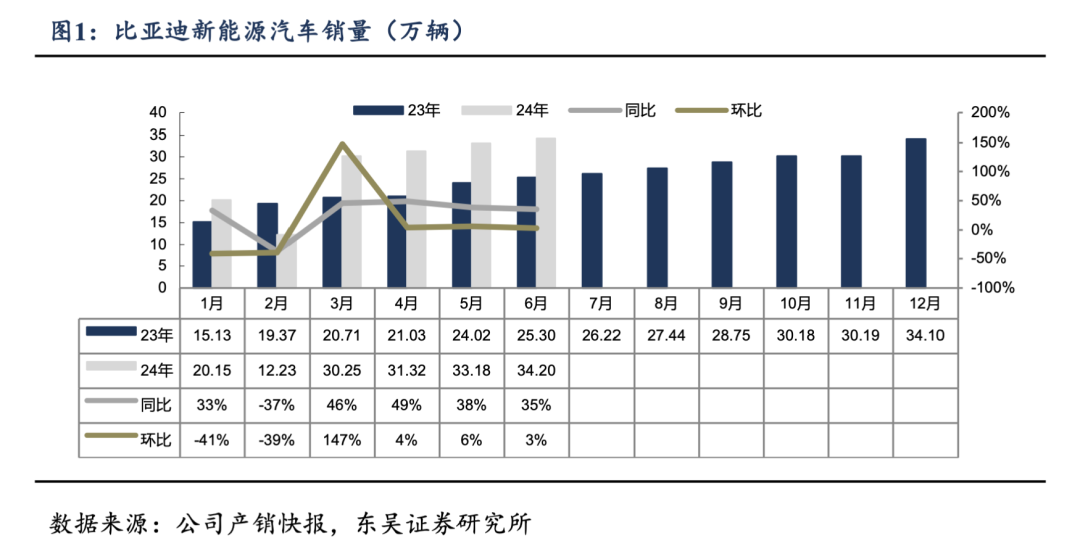 比亚迪6月电动车销量34.2万辆,同环比+35%/+3%,其中出口26995辆,同环比+156%/-28%,系七月起欧洲、巴西增加关税,部分出口提前抢运影响。比亚迪H1累计销161.3万辆,同增28.5%,24H1累计出口约20.3万辆,同增188%。秦L和海豹06订单爆发超预期,宋L DM-i等新车后续陆续推出,我们预计全年销量达380-400万辆,同增30%左右,其中出口50万辆,同比翻倍以上增长。