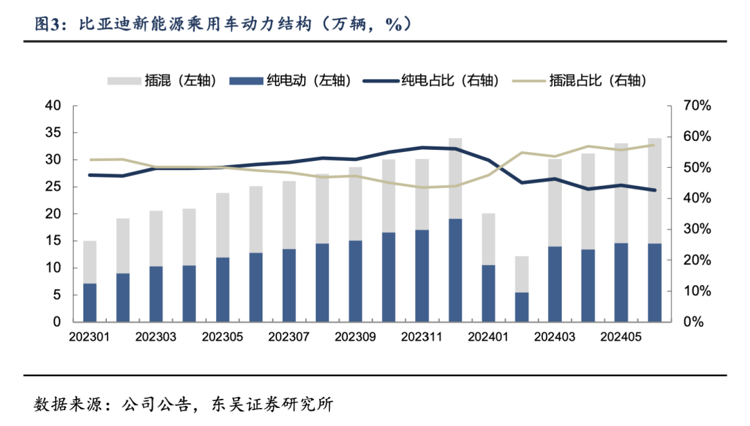 比亚迪6月插混乘用车销量为19.5万辆,同环比+58%/+6%,占比57%,同环比+8.3/+1.6pct;纯电乘用车销量为14.5万辆,同环比+13.2%/-0.8%,占比43%,同降8.3pct,环降1.6pct。高端车型方面,6月腾势销1.2万辆,同增2%,仰望销418辆,环降31%;方程豹销2680辆,环增10%。结构方面,比亚迪H1本土销量140.1万辆,同增19%,出口约20.3万辆,同增174%,高端销量8.3万辆,同增47%,出口和高端车型增速亮眼。