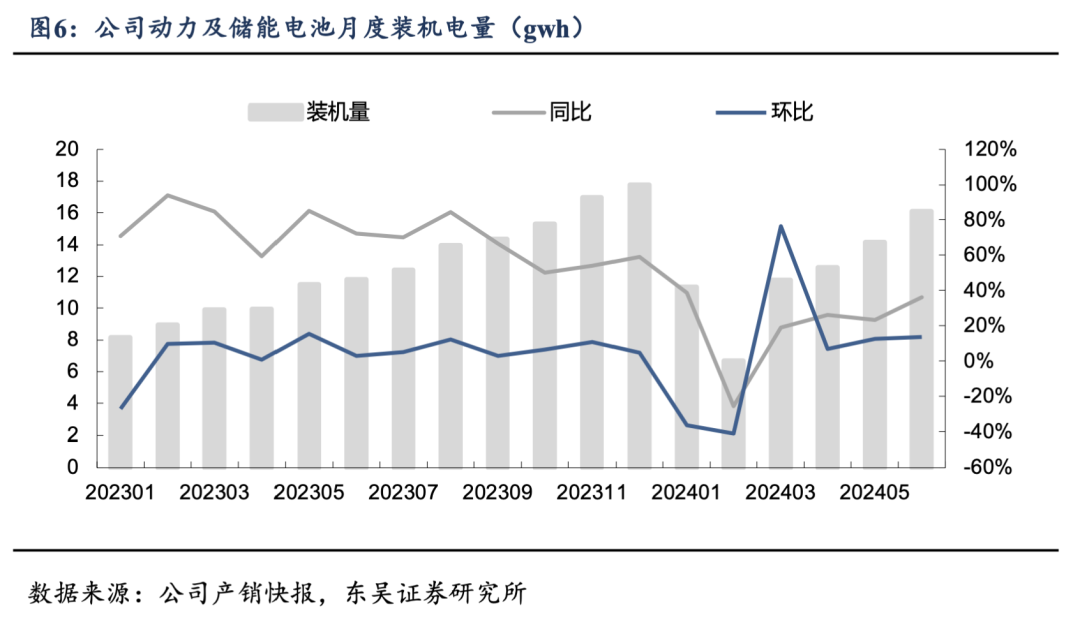 比亚迪6月动储电池装机16.1GWh,同环比+36%/+14%,1-6月累计装机72.6GWh,同增20%。比亚迪23年装机151gwh,我们预计对应出货190gwh,其中动力自供160gwh,动力外供10gwh,储能20gwh。24年看,销量中插电占比提升,单车带电量小幅下降,我们预计电池出货230gwh,同增20-25%。