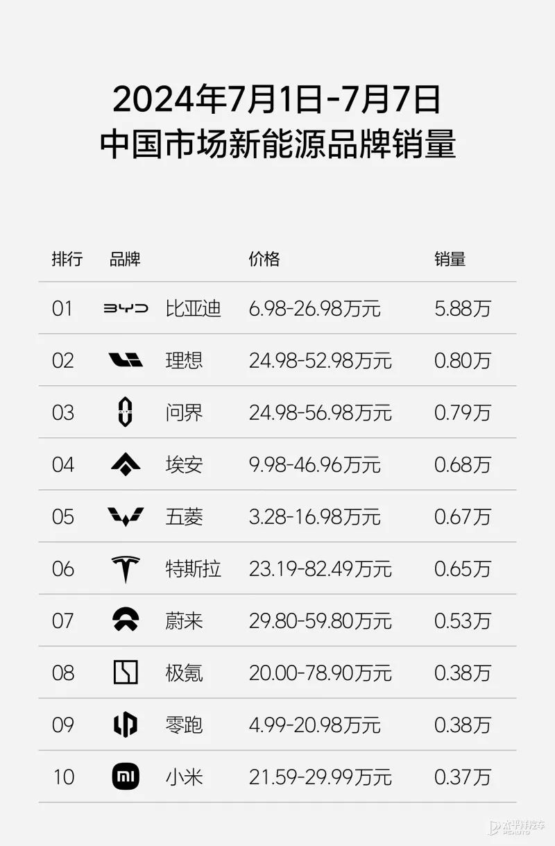 中国市场新能源品牌销量榜方面,比亚迪依然断层领先,周交付量达到5.88万辆。此前一直排名第二都特斯拉,如今掉到第六名,周销量更是仅有0.65万辆,不及理想与问界。面对中国品牌的围追堵截,特斯拉本月初推出了全新购车金融政策(5年0息方案),这或有助于提升它的市场竞争力。