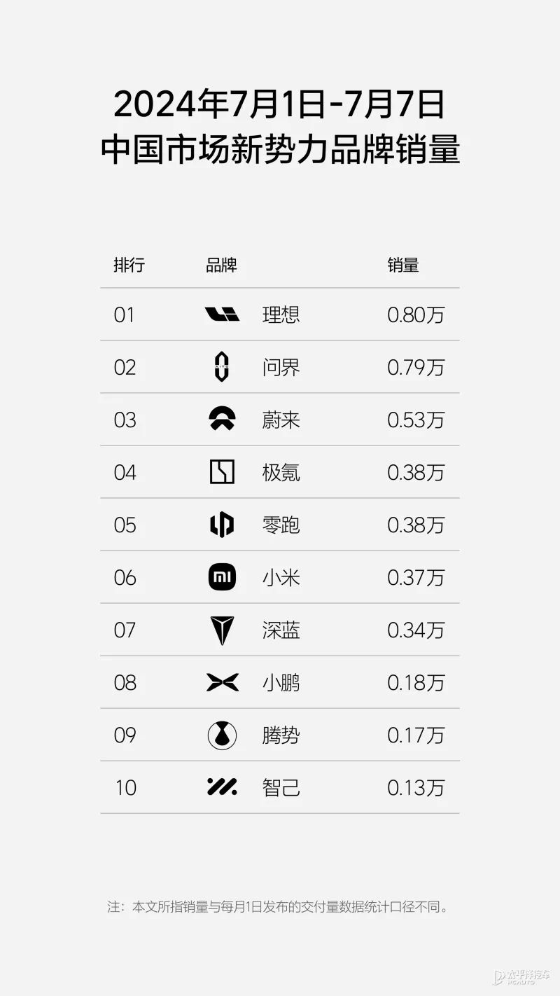 蔚来稳居第三名,目前已维持三周,上周销量为0.53万辆,紧随其后的分别是极氪和零跑上周均交付0.38万辆,而产能处于爬坡的小米,上周交付量再突破历史新高,达到0.37万辆,看来此前小米进行新一轮产线调优维护,效果显著。后面分别为小鹏、腾势和智己,周销量都在0.2万辆以下,整体格局没有太大变化。