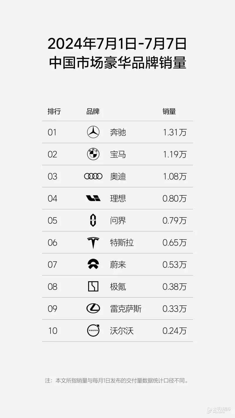 最后是中国市场豪华品牌方面,由于特斯拉表现不佳,前三甲依然是我们熟悉的奔驰、宝马和奥迪,其中奔驰和宝马轮流拿第一,周销量分别为1.31万辆、1.19万辆和1.08万辆。雷克萨斯和沃尔沃依旧是榜单倒数,周销量分别为0.33万辆和0.24万辆。