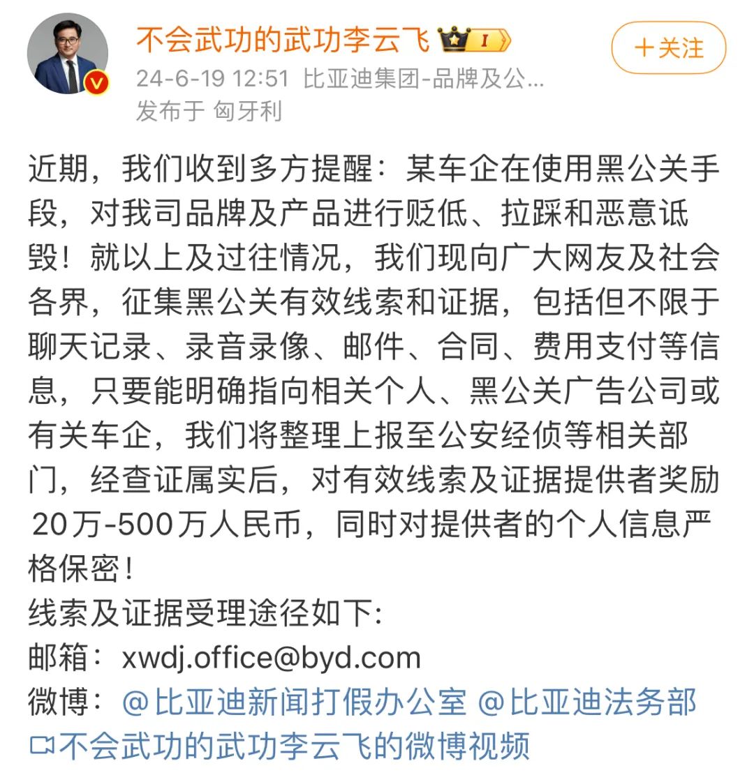 6月19日,比亚迪方发布微博称,近期某车企在使用黑公关手段,对比亚迪品牌及产品进行恶意诋毁。比亚迪向广大网友及社会各界征集黑公关有效线索和证据,经查证属实后,对有效线索及证据提供者奖励20万-500万元人民币,同时对提供者的个人信息严格保密。