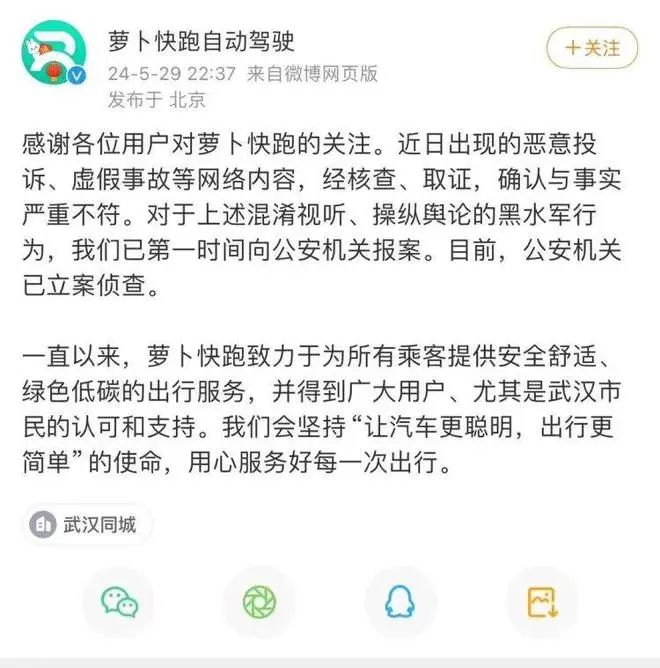 对此,萝卜快跑官方微博就曾在5月29日公开回应,称网络上的恶意投诉、虚假事故等均与事实严重不符。萝卜快跑已第一时间向公安机关报案。