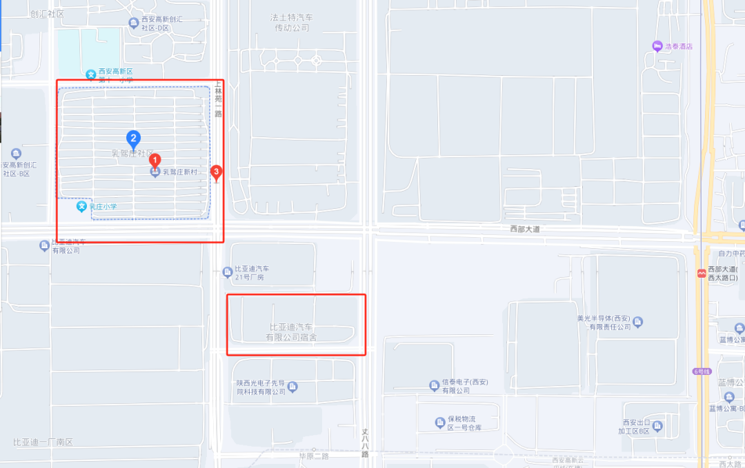 地图上,乳驾庄位于上林苑一路和西部大道交会处,东边法士特,南边则是2005年建成的比亚迪高新工业园。同比例缩小的情况下,乳驾庄的整体面积也不过两个多大小的比亚迪宿舍。但这个小小的村庄,还是承载了很多。