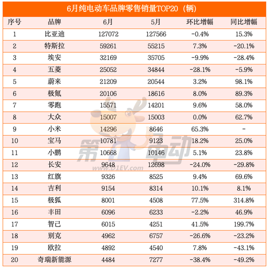 纯电动车品牌榜:七大品牌环比下滑,小米首进前十