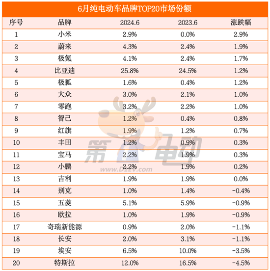 纯电动车市场份额涨跌幅榜:特斯拉、埃安大降