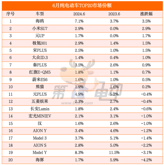 与去年同期相比,纯电动车TOP20榜中,10个车型的市场份额上涨,其中海鸥6月市场份额大涨3.5%,主要归功于今年3月6日上市的海鸥荣耀版,其比老款降价4000元,起售价来到6.98万元,性价比更高。