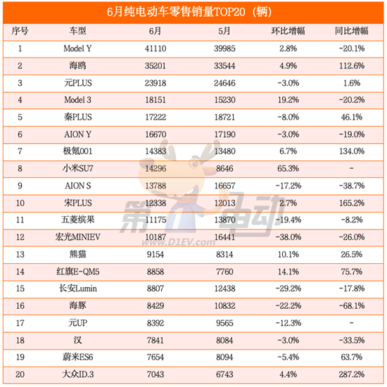 TOP20纯电动榜中,6款车来自比亚迪,其中除了海鸥和宋PLUS销量环比上涨外,元PLUS、秦PLUS、海豚、元UP、汉零售销量环比均出现下滑,且海豚销量环比大降22.2%,元UP销量环比下降超12%。