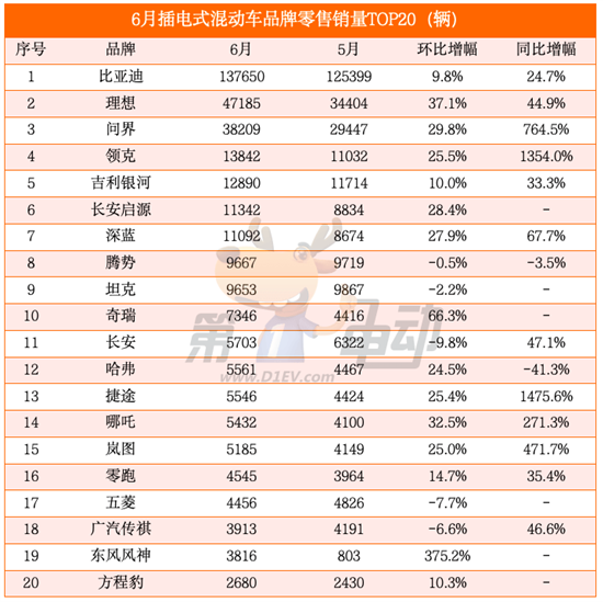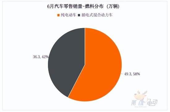 插电式混合动力车(包含增程)零售量36.3万辆,环比上涨17.5%,同比大涨67.3%,市占比42%,相比去年6月上升9.8个百分点。