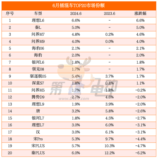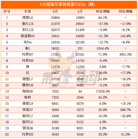 插混车型榜:理想L6首超秦PLUS夺冠,秦L、海豹06暴涨