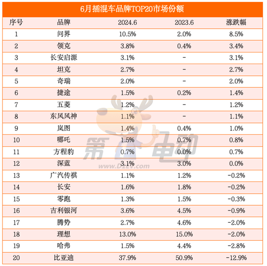 插混车市场份额涨跌幅榜:比亚迪大降14.2%