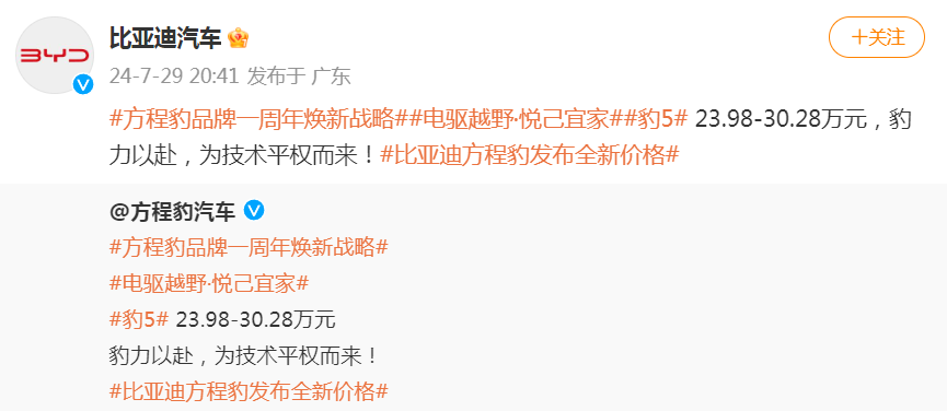 7月29日晚间,比亚迪旗下方程豹宣布品牌一周年焕新战略,“豹5”车型上线全新价格,售价区间现为23.98万元—30.28万元。