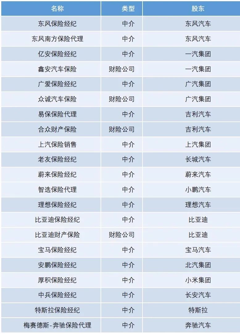 除了比亚迪,传统车企中大多数已经建立了保险中介机构,一汽集团、广汽集团、吉利等设立了财险公司。