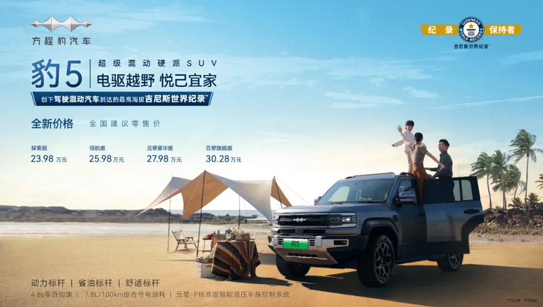 近日,比亚迪方程豹发布一周年品牌焕新战略,在致力于“技术平权”的新发展策略下,品牌旗下车型豹5采取全新价格,豹5探索版、领航版、云辇豪华版、云辇旗舰版四款车型都进行了5万元的价格调整,全新价格区间为23.98万元至30.28万元。