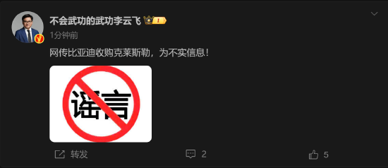 新浪科技讯 8月16日上午消息,近日,网传比亚迪收购克莱斯勒,比亚迪集团品牌及公关处总经理李云飞回应称:为不实消息!