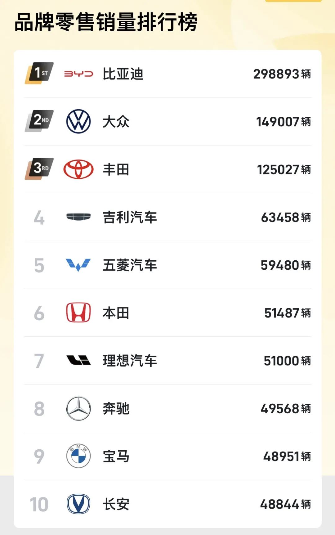 根据乘联会公布的国内车企零售销量榜单来看,不难看出市场竞争压力巨大,两极分化十分明显。《汽车行业关注》发现,其实单靠比亚迪就已经超越各系别市场,7月比亚迪零售销量为31.2万辆,同比增长35.0%,市场占有率为18.1%,而德日美系品牌市场份额分别为17.6%、12.9%、5.8%,均出现同比下滑。这是比亚迪市场份额首次超过德系,这不仅是比亚迪的历史性时刻,也是中国汽车的历史性时刻。作为对比,6月比亚迪汽车在国内市场的份额为15.9%,而德系品牌份额为18.6%。