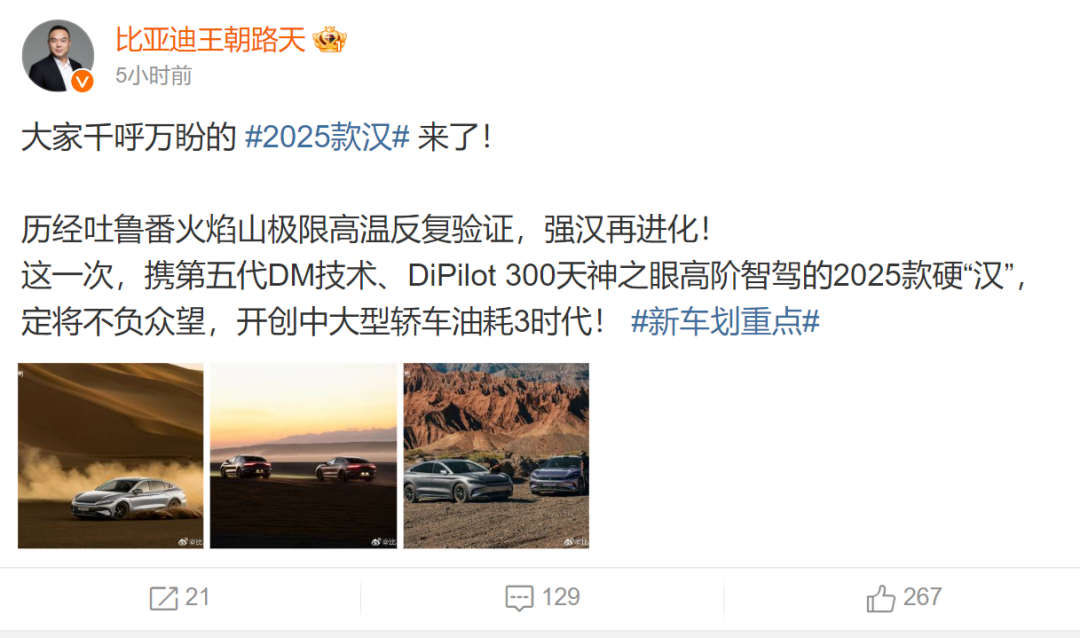 9月6日,比亚迪王朝销售事业部总经理路天在社交平台发布了2025款比亚迪汉的官图。据悉,新车将搭载第五代DM技术、DiPilot 300、云辇-C并换装了后五连杆悬架等,预期将有更出色的驾乘体验,新车将于9月9日正式上市。