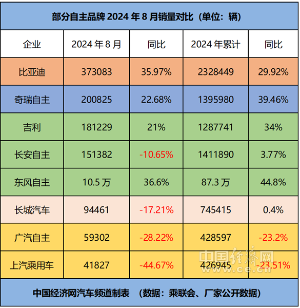 具体来看,8月,比亚迪、奇瑞自主、吉利、长安自主和长城的销量分别为373083辆、200825辆、181229辆、151382辆、94461辆,同比分别增长35.97%、22.68%、21%、-10.65%、-17.21%;前8个月的累计销量分别为2328449辆、1395980辆、1287741辆、1411890辆、745415辆,同比分别增长29.92%、39.46%、34%、3.77%、0.4%。