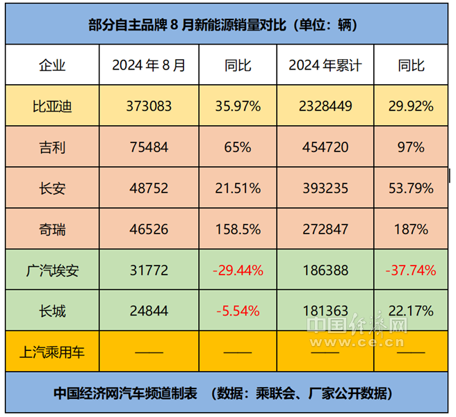相比之下,同样来自广东的新能源企业,广汽埃安的销量正遭遇“七连降“。数据显示,8月,埃安的销量为31772辆,同比下滑29.44%;前8个月累计销售186388辆,同比下滑37.74%。
