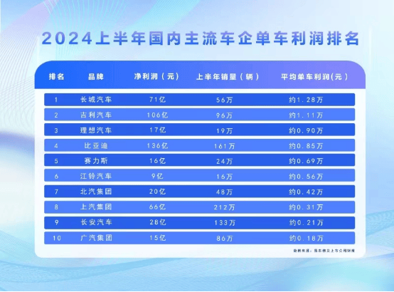 具体到单车利润上,据易车发布的2024年上半年主流车企单车利润排行榜,在国内主流上市车企中,单车利润排名前十的依次为长城、吉利、理想、比亚迪、赛力斯、江铃汽车、北汽集团、上汽集团、长安汽车、广汽集团。