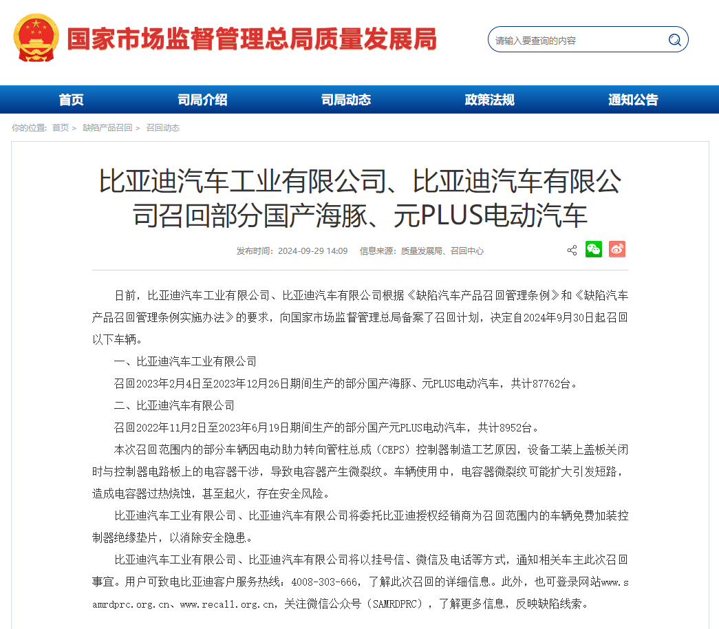9月29日,国家市场监管总局官网发布消息,比亚迪宣布召回共计96,714辆汽车,涉及部分国产海豚与元PLUS电动汽车。