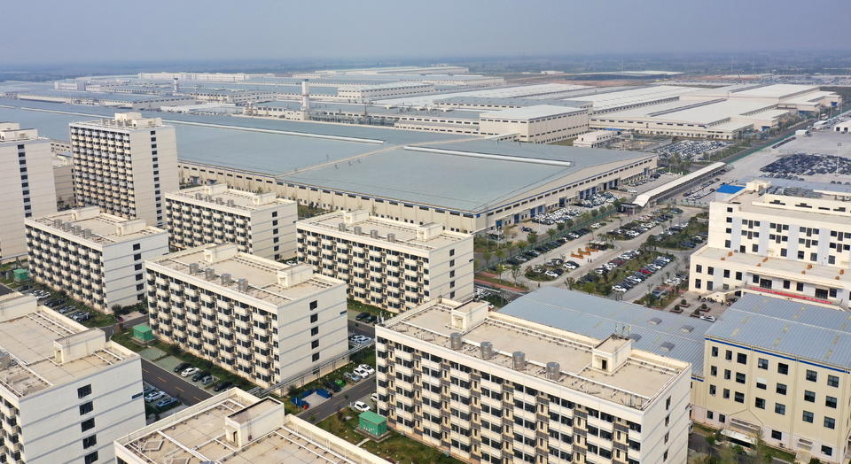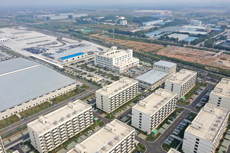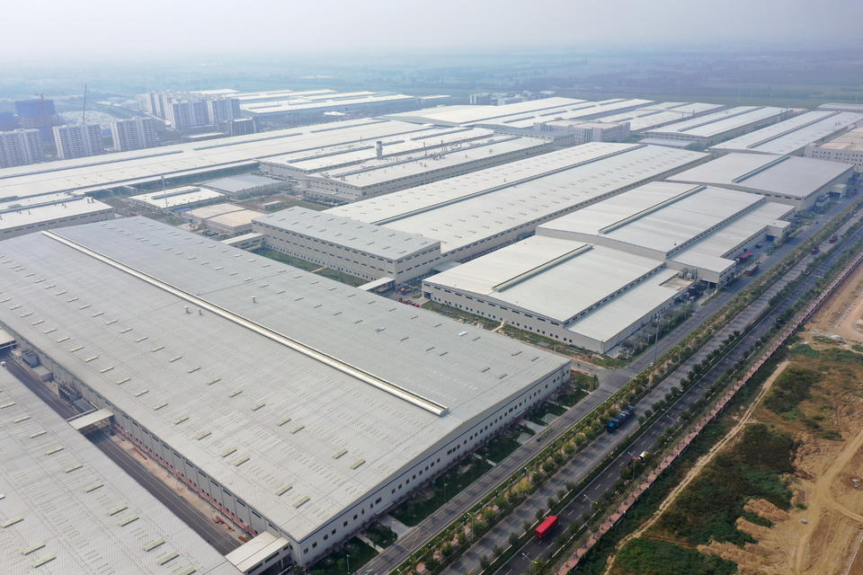 国庆假日,航拍济南起步区崔寨北侧的比亚迪汽车工业园全景。占地近6000亩的巨大工业园区气势雄伟,银灰色厂房连成一大片。