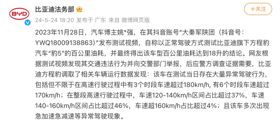 今年5月,比亚迪宣布起诉汽车博主姚*强,原因是其抖音账号“大秦军陕团”发布测试视频,自称以正常驾驶方式测试比亚迪旗下方程豹豹5的百公里油耗,并最终得出方程豹豹5每百公里油耗高达18升的结论。