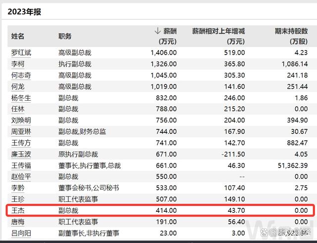根据年报披露,2023年王杰的薪酬为414万元,在高层中较为靠后。比亚迪有四位高层薪酬超过千万元,另有10位高层薪酬超过500万元,毕竟是民企,高管薪酬按照市场价来,没啥争议。