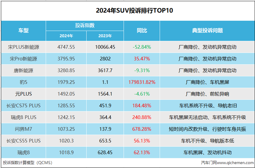 日前,2024年全年投诉指数正式发布,SUV投诉榜单也正式出炉。数据显示,2024年SUV的投诉指数相比2023年同比下降了2.09%。比亚迪旗下宋PLUS新能源、宋Pro新能源、唐新能源、豹5、元PLUS等5款车型因厂商降价、发动机异常启动的问题登上投诉榜单前五名。长安汽车旗下长安CS75 PLUS、长安CS55 PLUS因车机系统不升级的问题在年底集中爆发。问界M7因短期内改款升级、车身共振等问题被车主投诉。