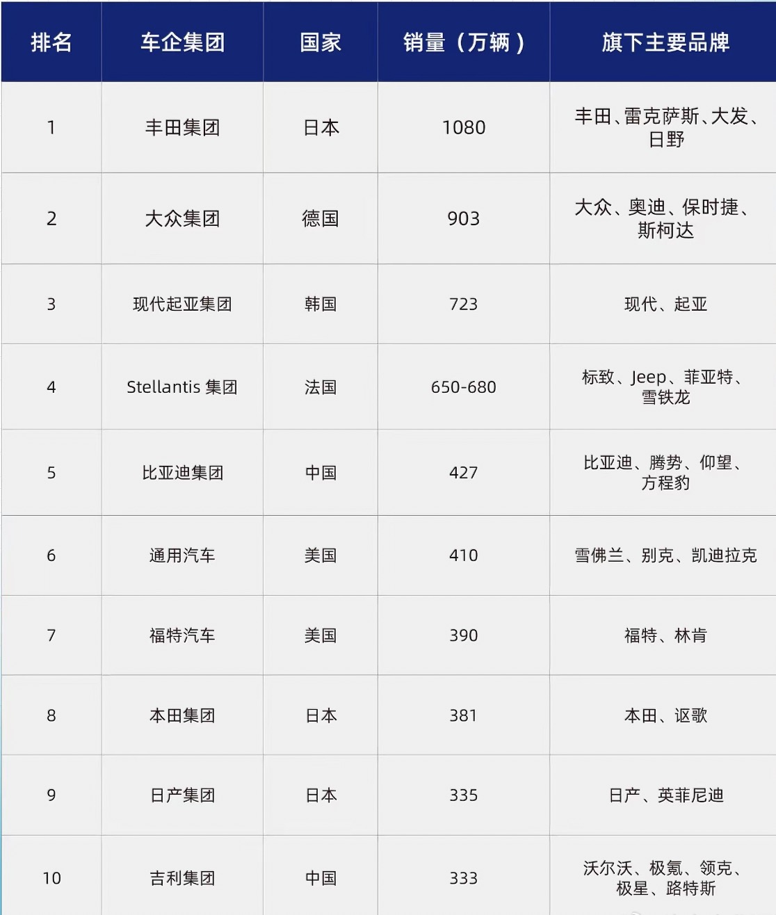 据韩国每日新闻报道,2024年全球车企销量品牌TOP10正式出炉,比亚迪、吉利两家中国车企跻身其中,分别位列第五、第十。丰田汽车集团以1080万辆排名第一,大众汽车集团、现代起亚汽车集团以903万辆、723万辆位列第二、第三名。Stellantis集团以650万-680万辆位列第四,比亚迪反超一众美日车企,以427万辆位居第五。接下来依次是通用汽车410万辆,福特汽车390万辆,本田集团381万辆,日产集团335万辆,吉利集团333万辆。