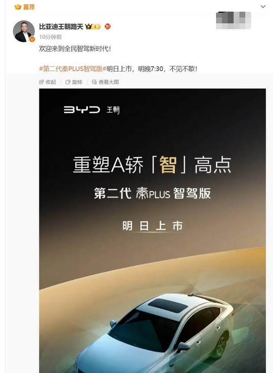 2月9日,比亚迪王朝网销售事业部总经理路天宣布,第二代秦PLUS智驾版车型将于2月10日晚7:30正式上市。这款备受瞩目的车型搭载了“天神之眼”高阶智驾系统、第五代DM技术以及DiLink 100智能座舱高阶版,并采用了龙颜美学设计。