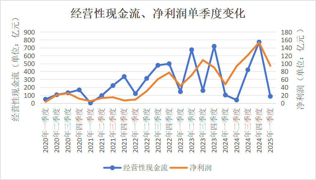 详细拆解比亚迪的现金流量表可发现,2025年一季度,比亚迪的经营性活动现金流净额为85.81亿元,同比减少16.10%,而净利润为94.43亿元,同比增长97.93%,经营性活动现金流与净利润的高增长出现了背离。