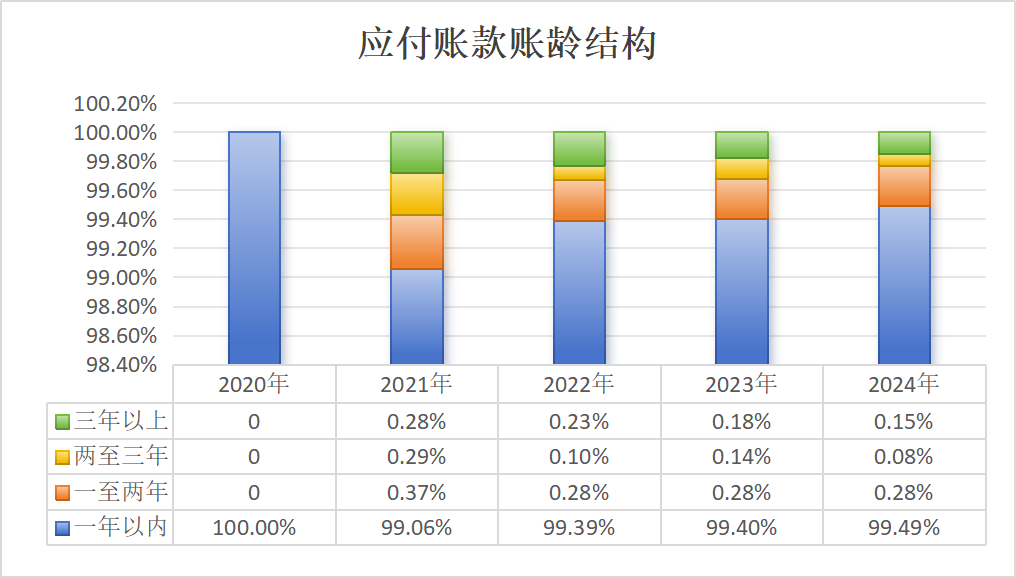 根据应付账款账龄结构占比,比亚迪99%以上应付账款的账龄都在一年以内,表明比亚迪与供应商结算周期较短,短期偿债情况良好,资金周转效率极高。这意味着,目前企业仍能与供应商保持稳定健康的关系,仅仅是合理利用商业信用延长付款周期,暂无恶意拖欠行为。