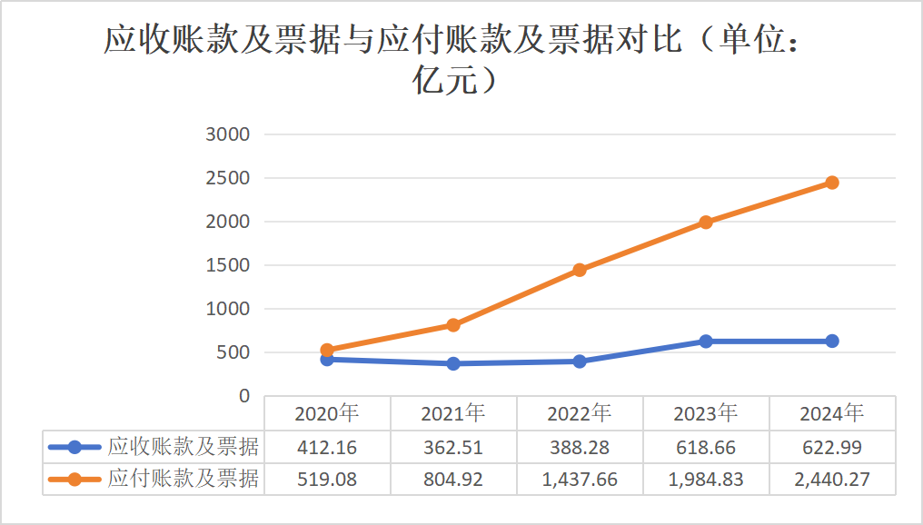 长期以来,比亚迪的应收账款数值和增速均低于应付账款及票据。2024年,比亚迪的应收账款及票据为622.99亿元,同比增长0.70%;应付账款及票据为2440.27亿元,同比增长22.95%。