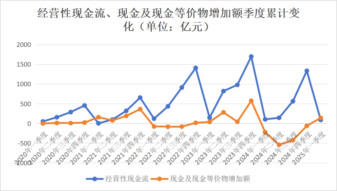 观察累计财报可知,截至2025年一季度,比亚迪的经营性现金流净额已经连续五个季度同比下降,现金及现金等价物增加额在2024年四个季度均为负值。