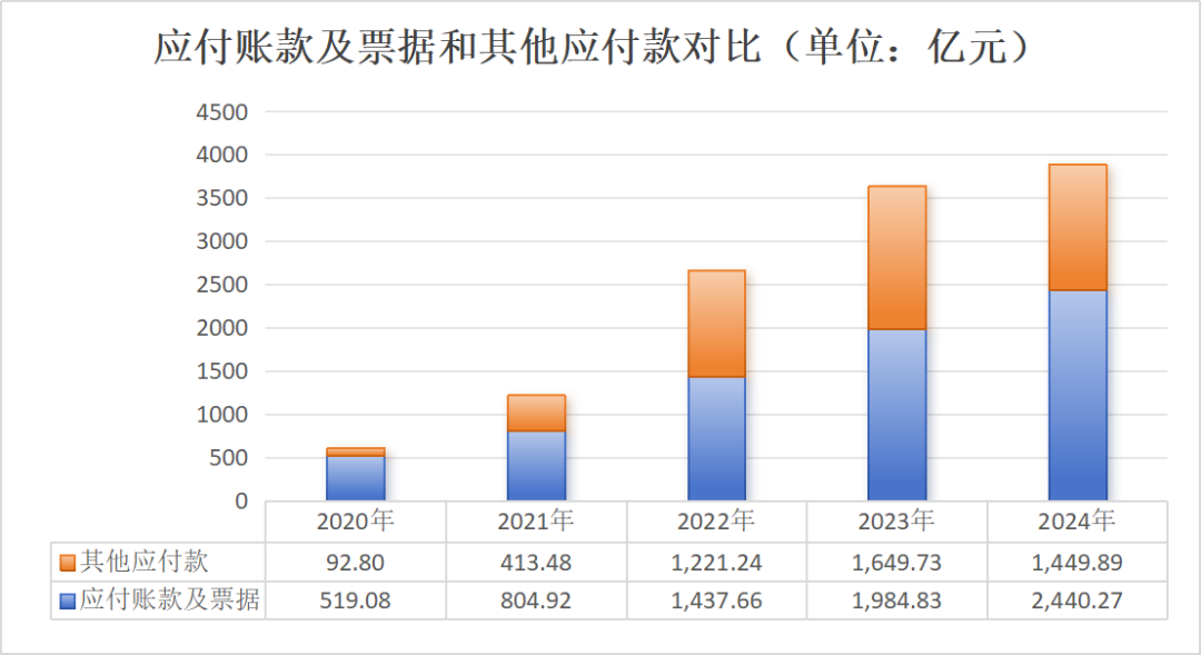 2024年财报显示,比亚迪的有息负债占比仅4.9%,但如下图所示,应付账款及票据高达2440.27亿元,且在逐年上升,存在将经营风险转嫁给供应商的可能性。