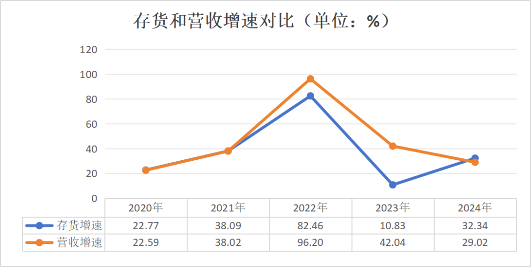 对比比亚迪的存货增速和营收增速,也可看出它的激进策略。2024年,存货增速略高于营收增速,可能导致部分月份产量高于销量,存在库存积压。