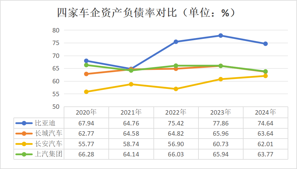 近三年,比亚迪的资产负债率显著提高,2022年突破了75%。虽然去年控制了资产负债率水平,但仍然显著高于其他三家(长城汽车、长安汽车、上汽集团)。
