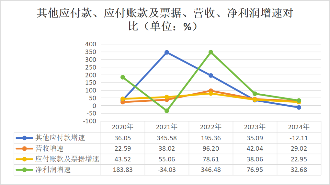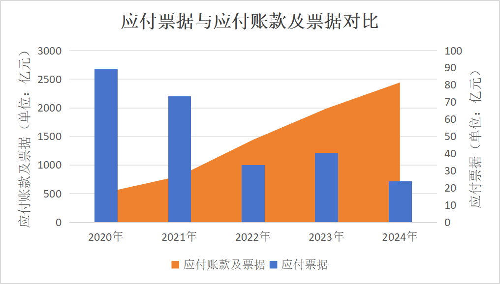 但需要注意的是,比亚迪的应付票据占应付账款及票据的比例极小,2024年仅占约1%。且近五年比亚迪的应付票据呈下降趋势,2024年应付票据总额为23.84亿元,同比下降41.18%,这与应付账款及票据总额的上升趋势不符。