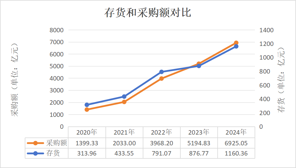 而2024年年末比亚迪仍有1160.36亿元的存货余额,相当于比亚迪在2024年汽车业务收入的近五分之一。