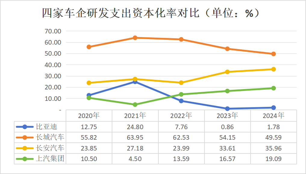 2024年,比亚迪的研发支出资本化率仅1.78%,远低于长城汽车的49.59%,长安汽车的35.96%,上汽集团的19.09%。