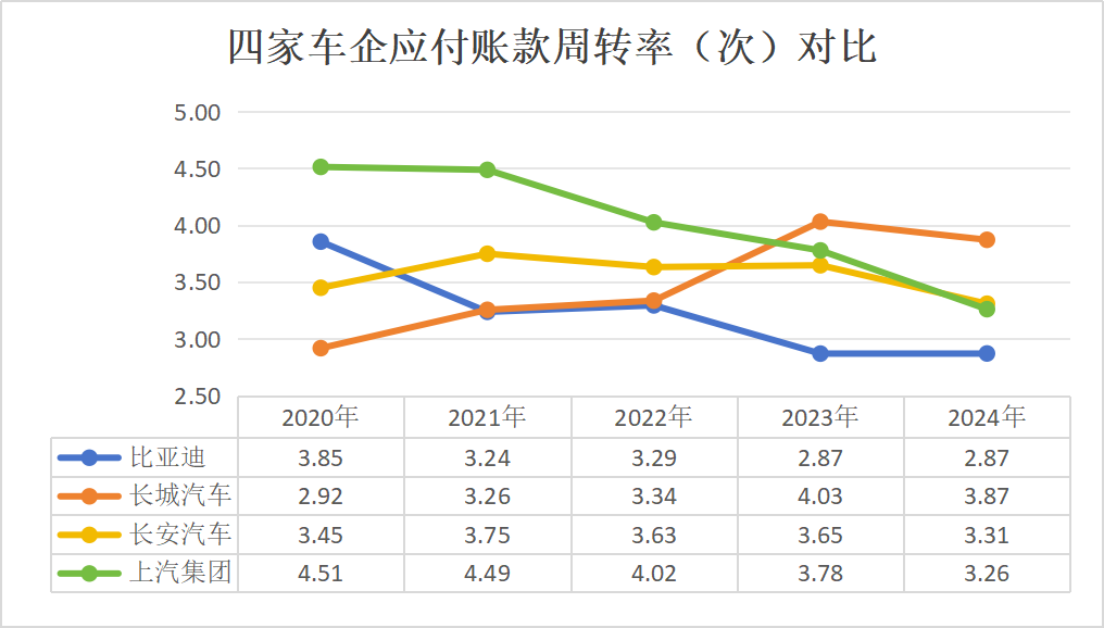 此外,比亚迪的应付账款周转率(次)也在逐年下降,在2024年降至2.87,显著低于同行公司。