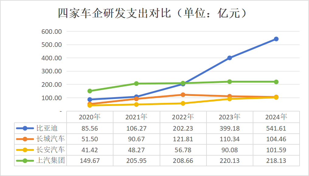 2024年,比亚迪的研发支出为541.61亿元,同比增长35.68%;2025年第一季度研发支出为142.23亿元,同比增长34.04%。若按照同比增长30%来计算,2025年比亚迪的研发支出将超过700亿元。