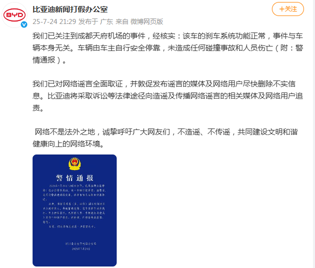 另外,7月24日,一段"比亚迪在成都天府机场失控转圈"的短视频突然刷屏。视频里,司机蒋某因情绪激动的操作被刻意剪辑,配上"刹车失灵"的解说,瞬间点燃舆论,引起大量转发关注。