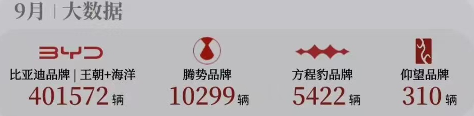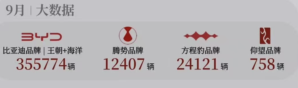 所以,在9月销量中比亚迪品牌的跌幅最大,同比下滑超11.4%。之所以比亚迪最终整体销量同比下滑5.5%,是因为方程豹品牌9月销量同比暴增348%,相当于拉了比亚迪品牌一把。