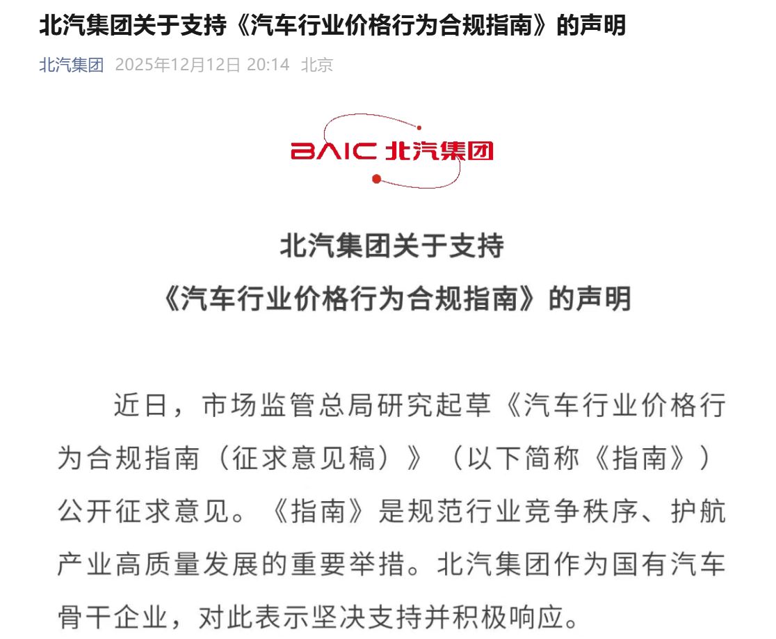 北汽集团 也发声明称,近日,市场监管总局研究起草《汽车行业价格行为合规指南(征求意见稿)》(以下简称《指南》)公开征求意见。《指南》是规范行业竞争秩序、护航产业高质量发展的重要举措。 北汽集团 作为国有汽车骨干企业,对此表示坚决支持并积极响应。