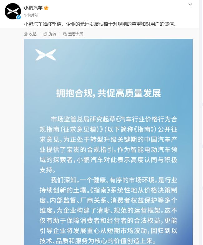 同日, 小鹏汽车 官博发文称,公司对市场监管总局研究起草的《汽车行业价格行为合规指南(征求意见稿)》表示高度认同与积极支持。 小鹏汽车 表示,将全面审视并持续优化自身的价格管理与合规体系,确保从产品定价到销售服务的每一个环节都更加透明、规范。承诺将严格遵守明码标价原则,保障消费者的知情权与选择权,坚决杜绝任何形式的价格欺诈与不正当竞争行为。