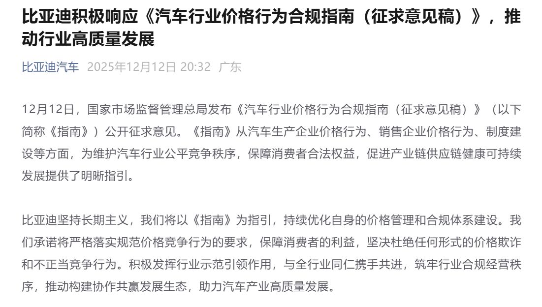 12月12日, 比亚迪 发文称,12月12日, 国家市场监督管理总局 发布《汽车行业价格行为合规指南(征求意见稿)》(以下简称《指南》)公开征求意见。《指南》从汽车生产企业价格行为、销售企业价格行为、制度建设等方面,为维护汽车行业公平竞争秩序,保障消费者合法权益,促进产业链供应链健康可持续发展提供了明晰指引。
